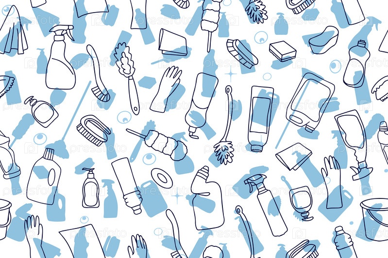 Модный бесшовный рисунок уборочного оборудования. Значки линии уборки. Линия нарисованного вручную оборудования, чистящих средств и инструментов для мытья и дезинфекции дома, ведро и швабра, распылитель моющего средства. Вектор