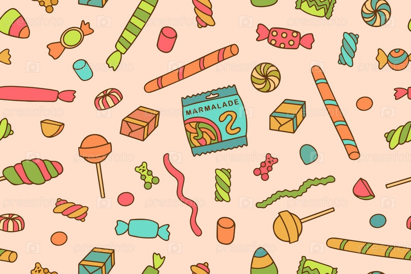 Бесшовный узор с красочными конфетами и сладостями. Текстура для баннеров, обоев, текстиля, оберточной бумаги, кондитерских изделий или детской вечеринки