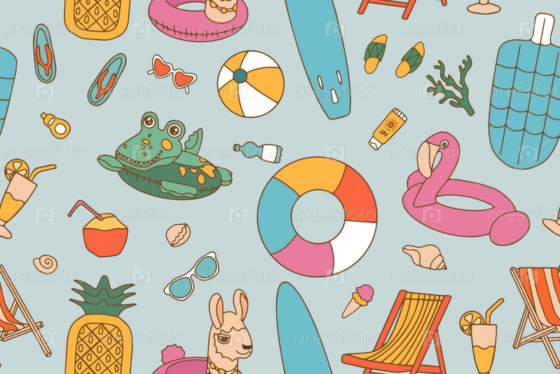 Бесшовный яркий узор из элементов для плавания в стиле каракули. Надувные кольца и пляжные принадлежности на синем фоне.Вектор