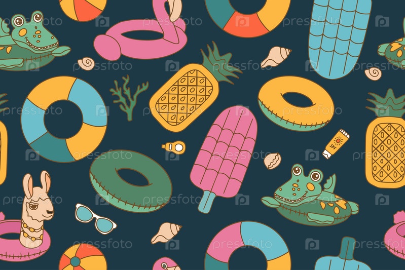 Бесшовный яркий узор из каракули элементов плавательных кругов, мячей, солнцезащитных очков и маски в стиле каракули. Надувные круги и пляжные принадлежностиВекторная иллюстрация. Вектор