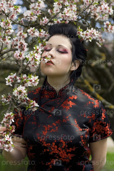 Японская девушка нюхает цветы