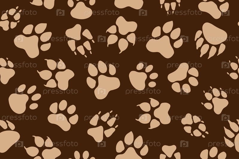 Бесшовный узор из отпечатков лап животных, векторные отпечатки ног разных животных. Коричневый фон с отпечатками лап. Собака лиса волк медведь кошка лев леопард тигр. Вектор