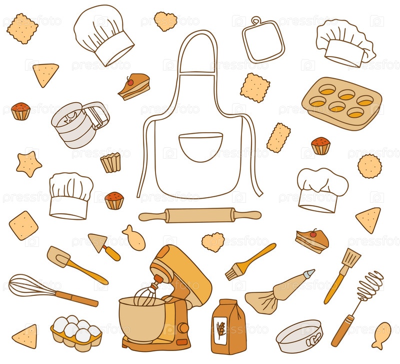 Красочная модная коллекция аксессуаров для выпечки. Набор кондитера для приготовления вкусной выпечки в стиле каракули на белом фоне. Вектор