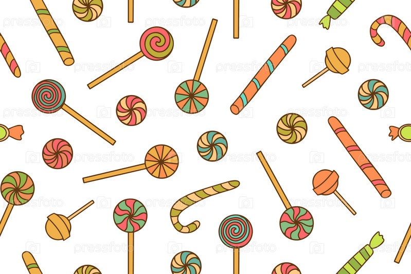 Векторный бесшовный узор из разноцветных леденцов разных форм. Ручной рисунок текстуры, фон. На День святого Валентина, украшение кондитерской