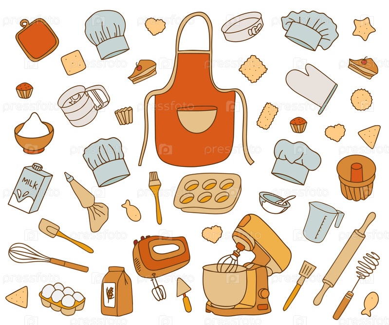 Красочная модная коллекция аксессуаров для выпечки. Набор кухонных принадлежностей для приготовления пищи в стиле каракули на белом фоне. Вектор