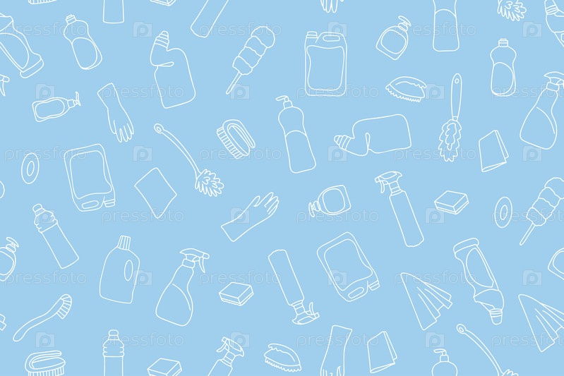 Бесшовный узор из уборочного оборудования. Значки линии уборки. Линия нарисованного вручную оборудования, чистящих средств и инструментов для мытья и дезинфекции дома, ведро и швабра, распылитель моющего средства. Вектор
