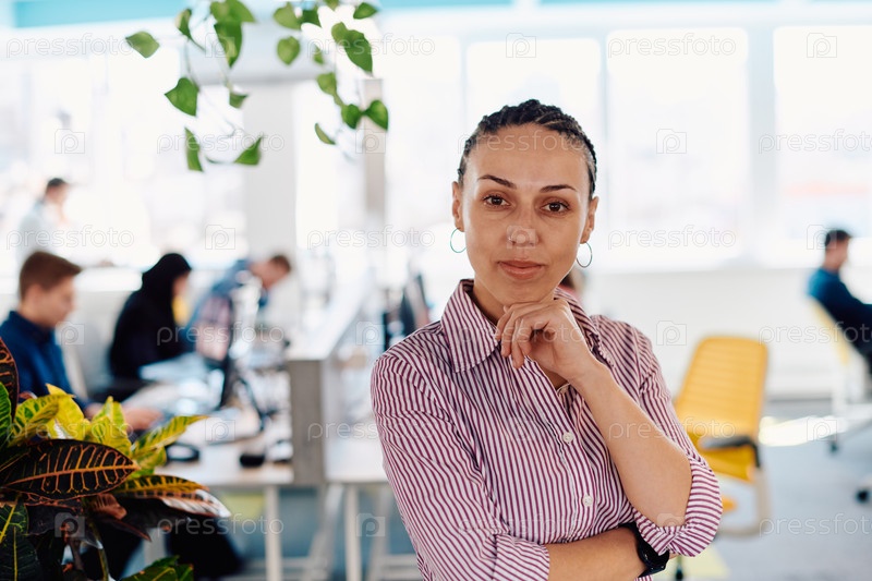 Портрет молодой улыбающейся деловой женщины в креативном открытом пространстве коворкинга стартап-офиса. Успешная бизнес-леди стоит в офисе с копирайтом. Коллеги, работающие на заднем плане