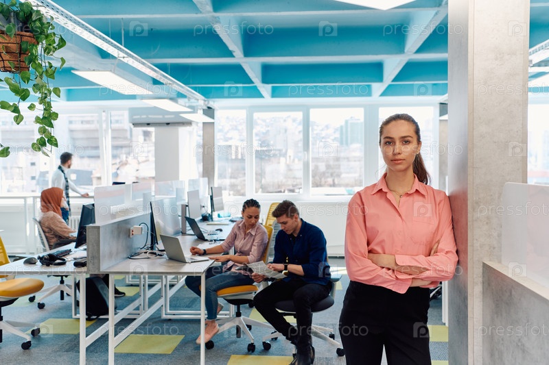 Портрет молодой улыбающейся деловой женщины в креативном открытом пространстве коворкинга стартап-офиса. Успешная бизнес-леди стоит в офисе с копирайтом. Коллеги, работающие на заднем плане