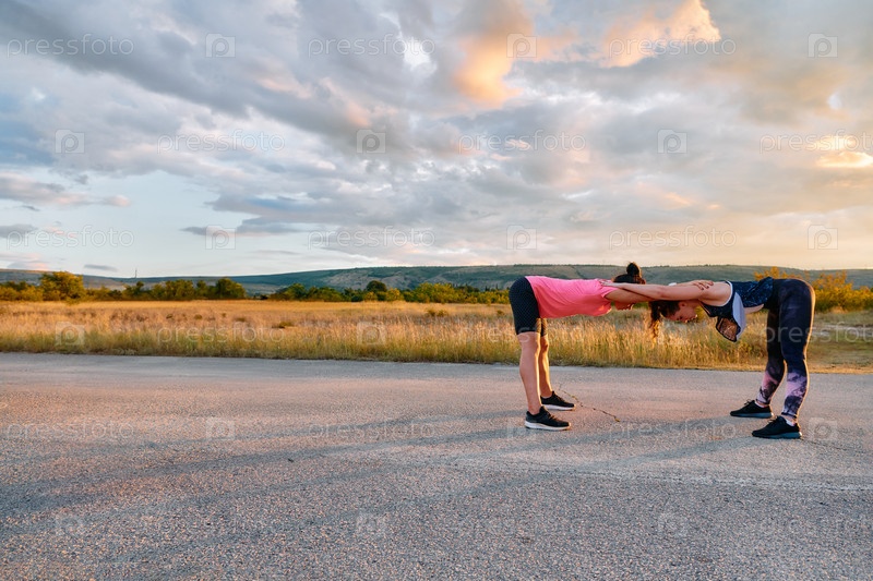 Женщины-спортсменки занимаются растяжкой на закате в окружении прекрасной природы