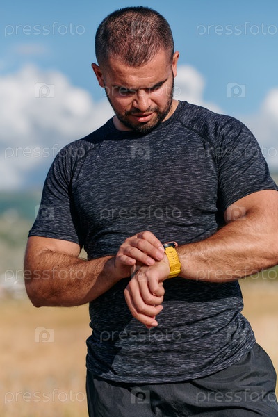 Спортивный мужчина проверяет результаты бега на смарт-часах