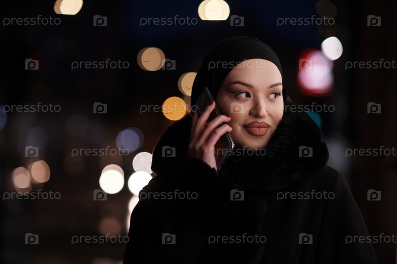 Европейская мусульманка в хиджабе, бизнес-леди, проверяет свой телефон на городской улице ночью