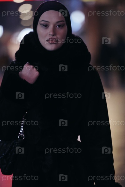 Мусульманка идет по городской улице холодной зимней ночью в хиджабе