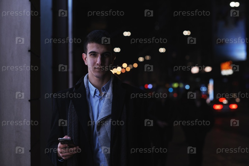 Улыбающийся мужчина с Востока идет по улице возле современного офисного здания,