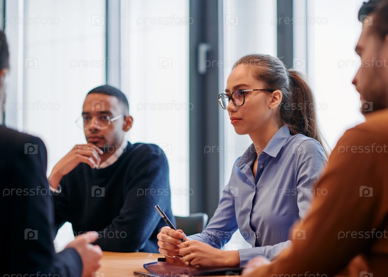 В яркой атмосфере современного офиса стартапа разнообразная команда профессионалов в сфере бизнеса участвует в обсуждениях различных проектов и разрабатывает новые бизнес-стратегии, олицетворяя креативность и инновации в предпринимательской среде
