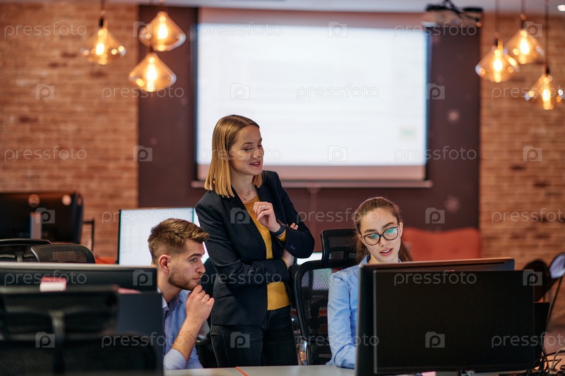 Стратегическая бизнес-встреча: группа профессионалов, работающих в офисе с использованием компьютеров