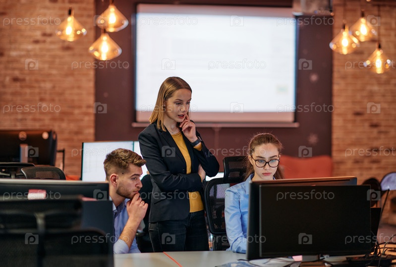 Стратегическая бизнес-встреча: группа профессионалов, работающих в офисе с использованием компьютеров