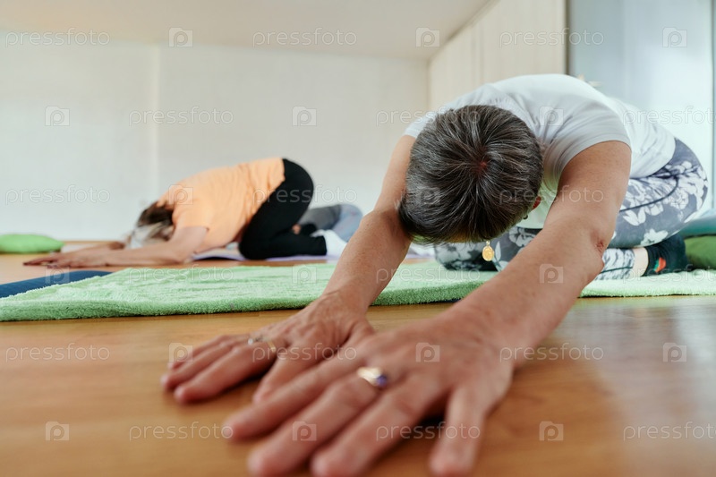 Женщины старшего возраста занимаются оздоровлением: йогой и растяжкой в залитом солнцем пространстве