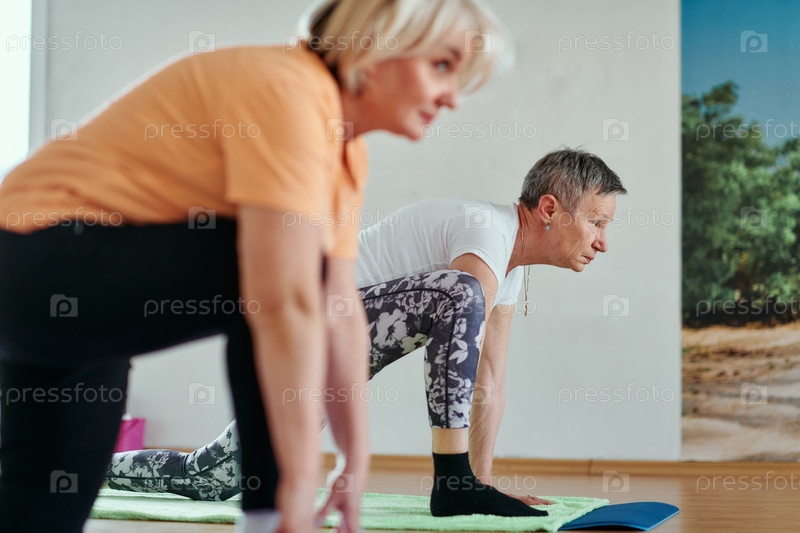 Женщины старшего возраста занимаются оздоровлением: йогой и растяжкой в залитом солнцем пространстве