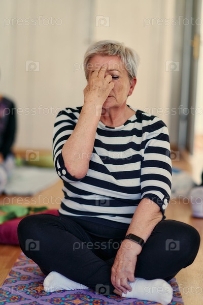 Пожилая женщина практикует успокаивающие традиционные упражнения с мягким жестом лба