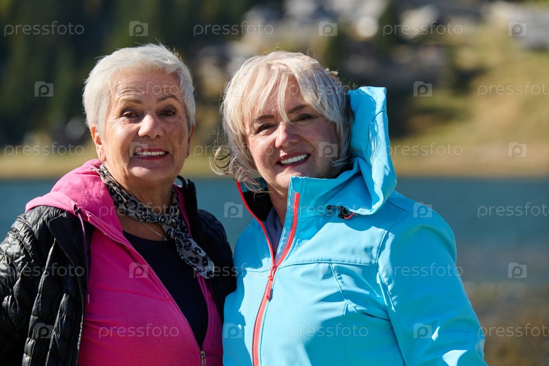 Пожилые женщины-туристы стоят на горе, наслаждаясь днем похода - Улыбающиеся туристы-альпинисты наслаждаются отпуском и здоровым образом жизни - Свобода, успех, спортивная концепция