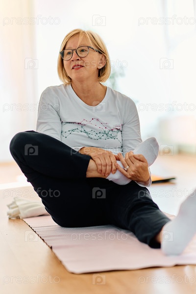 В залитом солнцем помещении пожилая женщина грациозно занимается омолаживающей йогой, уделяя особое внимание растяжке шеи, спины и ног, воплощая спокойствие и благополучие