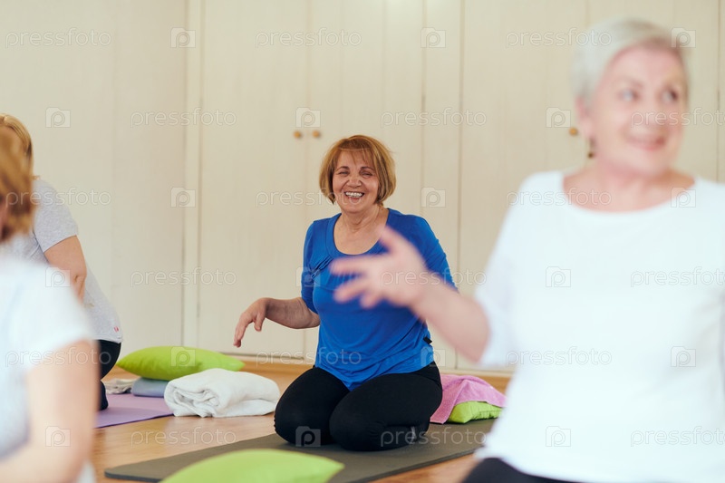 Группа пожилых женщин занимается различными упражнениями йоги, включая растяжку шеи, спины и ног, под руководством тренера в залитом солнцем месте, способствуя благополучию и гармонии