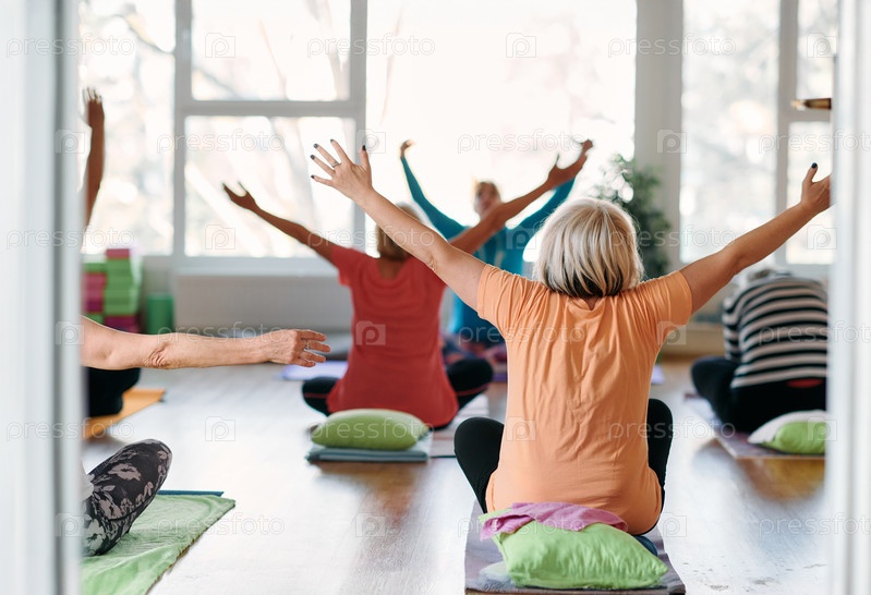 Женщины старшего возраста занимаются оздоровлением: йогой и растяжкой в залитом солнцем пространстве