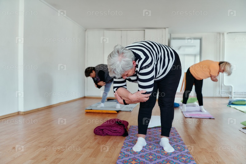 Женщины старшего возраста занимаются оздоровлением: йогой и растяжкой в залитом солнцем пространстве