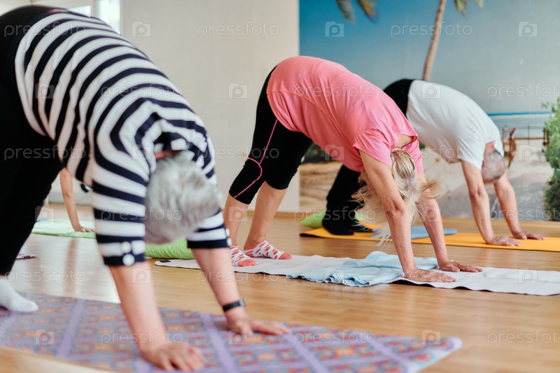 Женщины старшего возраста занимаются оздоровлением: йогой и растяжкой в залитом солнцем пространстве