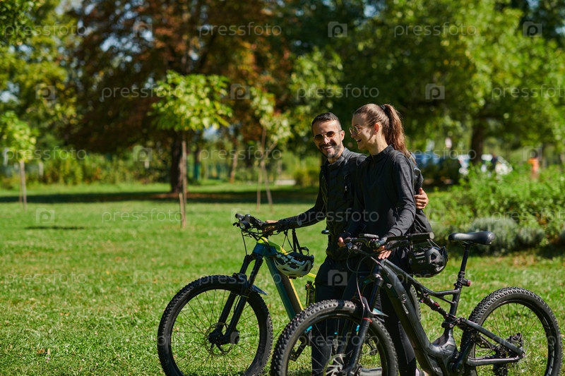 Счастливая пара, одетая в профессиональную велосипедную экипировку, наслаждается романтической велопрогулкой по парку, окруженному современными природными достопримечательностями, излучая любовь и счастье