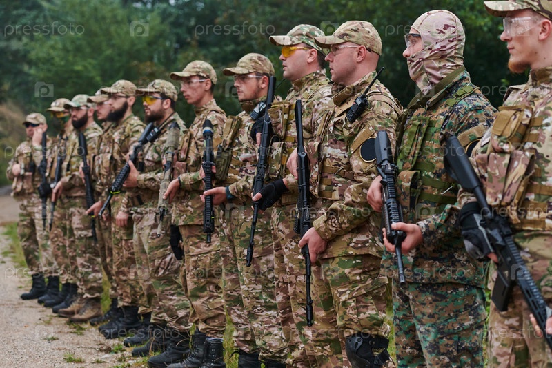 Солдаты-бойцы стоят вместе с оружием. Групповой портрет элитных членов армии США, военнослужащих частной военной компании, антитеррористического отряда