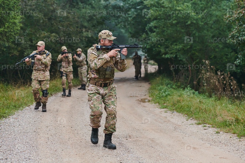 Дисциплинированное и специализированное военное подразделение, облаченное в камуфляж, осуществляющее стратегическое патрулирование и сохраняющее контроль в обстановке с высокими ставками, демонстрирующее свою точность, сплоченность и готовность к специаль
