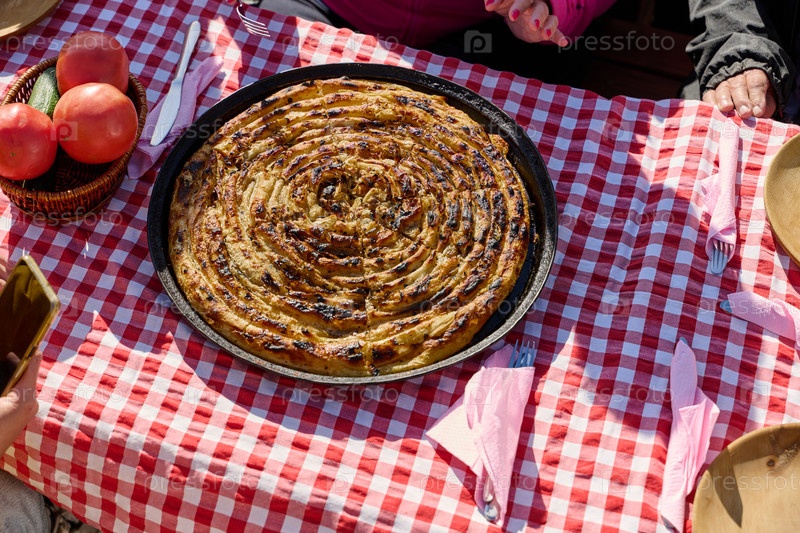 Изысканно приготовленное, это традиционное боснийское блюдо представляет собой аппетитный пирог под своей крышкой, идеально пропеченный и готовый порадовать гостей, воплощая в себе богатое кулинарное наследие и манящие вкусы боснийской кухни