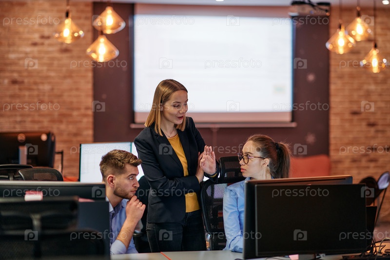 Стратегическая бизнес-встреча: группа профессионалов, работающих в офисе с использованием компьютеров
