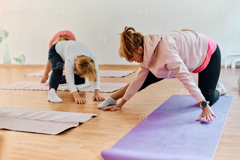 Группа пожилых женщин занимается различными упражнениями йоги, включая растяжку шеи, спины и ног, под руководством тренера в залитом солнцем месте, способствуя благополучию и гармонии