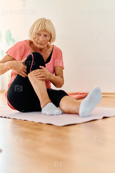 В залитом солнцем помещении пожилая женщина грациозно занимается омолаживающей йогой, уделяя особое внимание растяжке шеи, спины и ног, воплощая спокойствие и благополучие