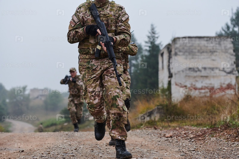 Дисциплинированное и специализированное военное подразделение, облаченное в камуфляж, осуществляющее стратегическое патрулирование и сохраняющее контроль в обстановке с высокими ставками, демонстрирующее свою точность, сплоченность и готовность к специаль
