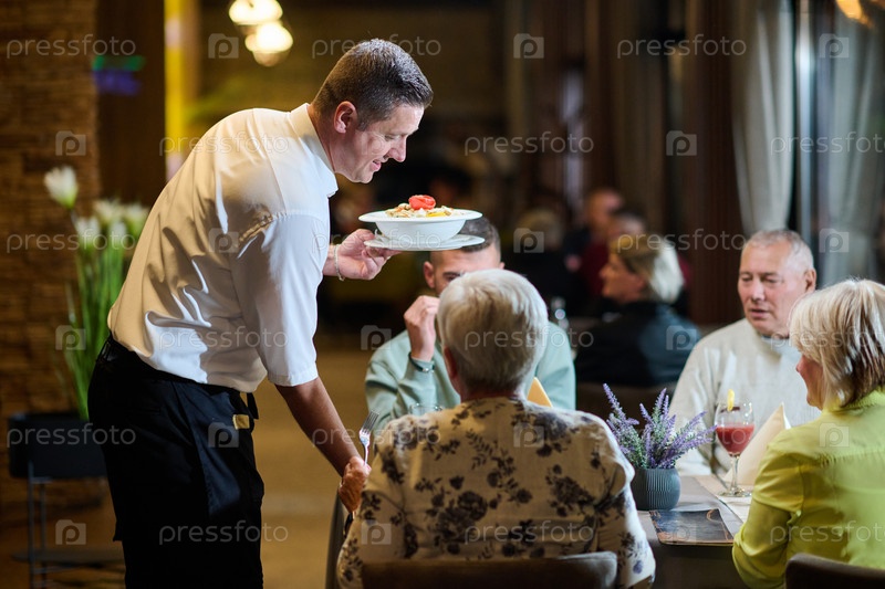 Вежливый официант безупречно обслуживает пожилую семью и их друзей, создавая дружественную атмосферу, когда они собираются за общим обедом, наслаждаясь разнообразными и изысканными блюдами современной кулинарии