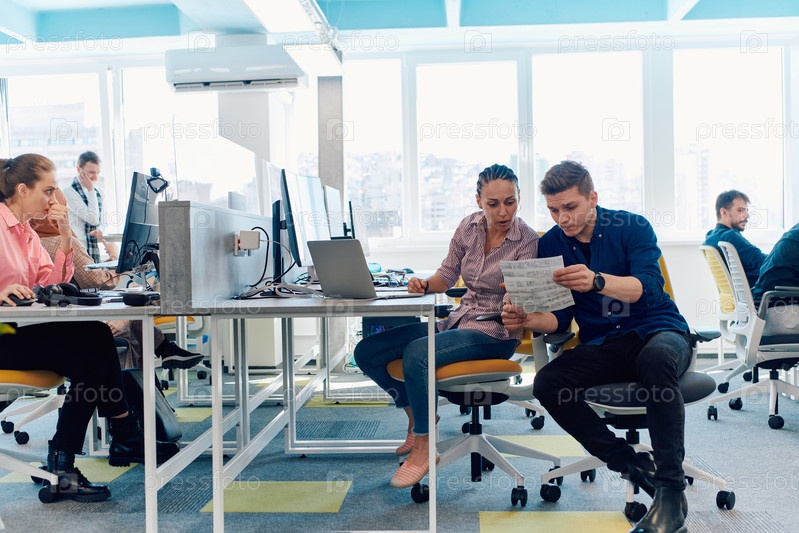 Совместный процесс многонациональной квалифицированной молодой бизнес-команды во время мозгового штурма в офисе. Разнообразная группа молодых людей, одетых в официальную одежду, сотрудничает в разработке дизайн-проекта