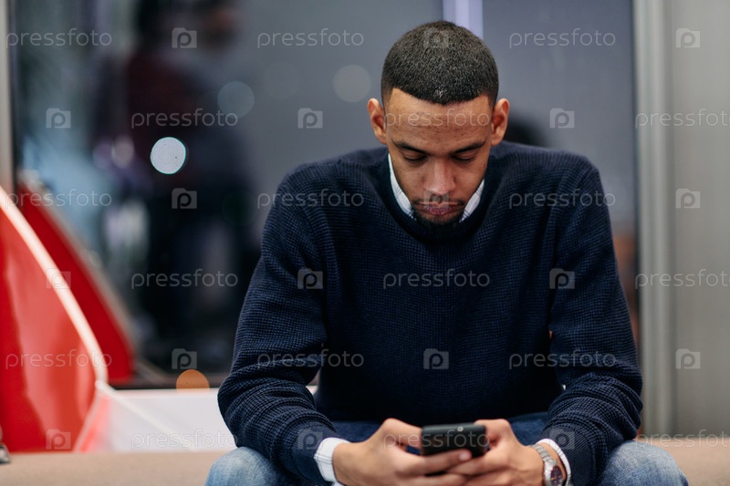 Молодой афроамериканец работает в коворкинг-пространстве, используя смартфон, анализируя тенденции онлайн-рынка, сосредоточенный мужчина-работник читает финансовые новости или просматривает интернет на телефоне. Концепция технологии