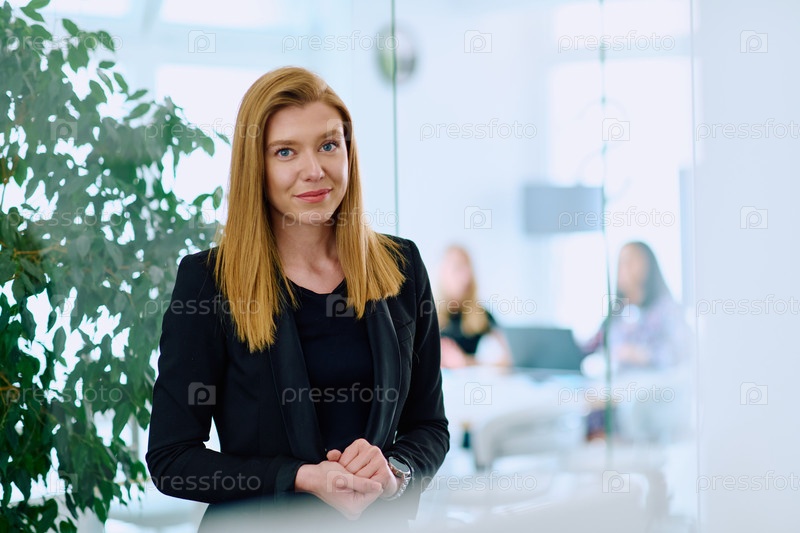 Портрет светловолосой деловой женщины в современном офисе с ее рабочим пространством и коллегами на заднем плане