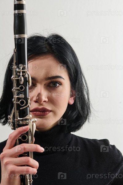 Изящная брюнетка-музыкант позирует с кларнетом на белом фоне