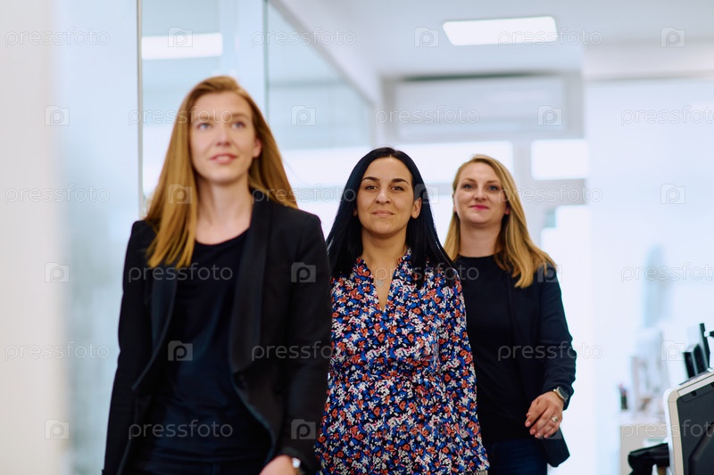 Уверенные в себе деловые женщины шагают по коридору офиса, увлеченные обсуждением чего-то