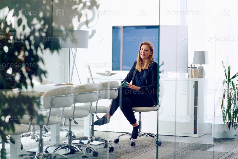 Предпринимательница работает над проектами в современном стеклянном офисе