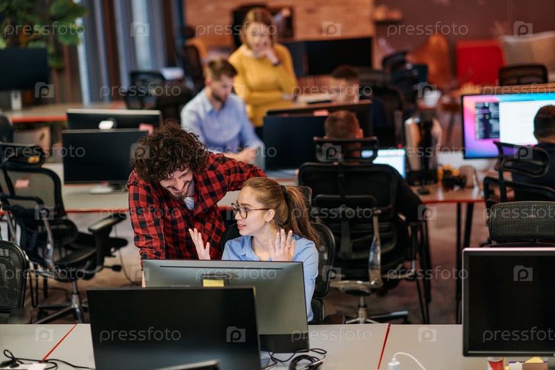 Коллеги по бизнесу, мужчина и женщина, обсуждают бизнес-стратегии, внимательно глядя на монитор компьютера, олицетворяя сотрудничество и инновации