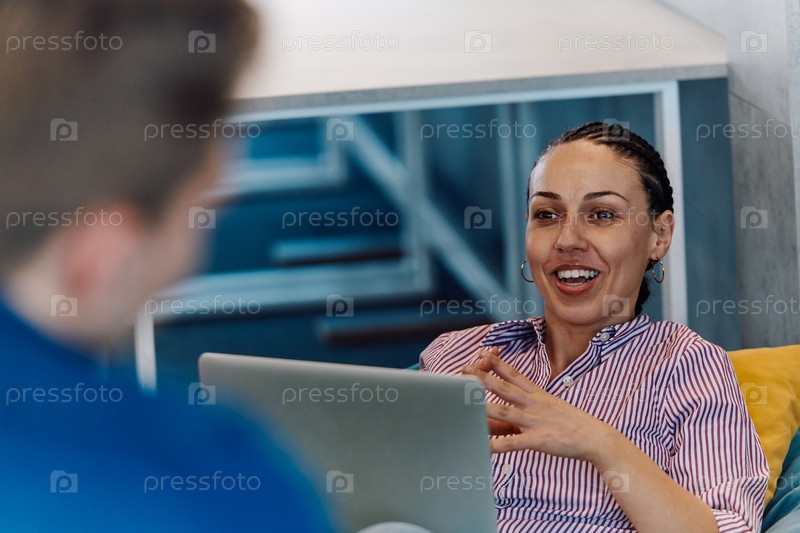 Современный программист обсуждает будущие бизнес-проекты с коллегами в современном офисе стартапа