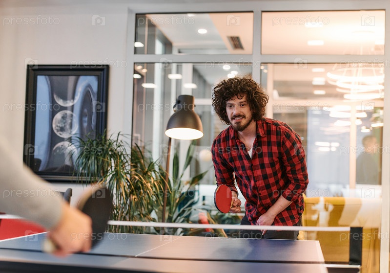 Коллеги по бизнесу отдыхают от работы, чтобы поиграть в настольный теннис, способствуя командной работе и товариществу на рабочем месте