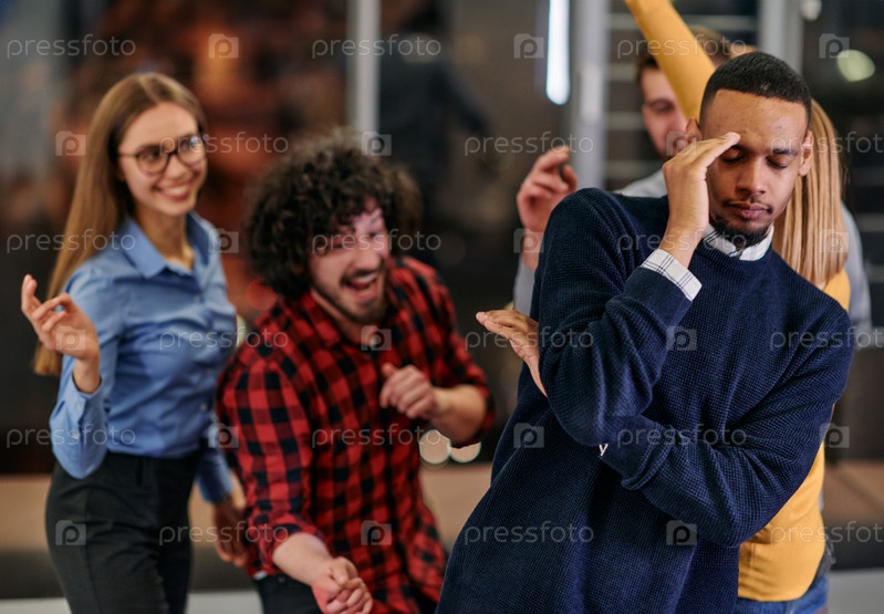 Группа молодых бизнесменов развлекается, играя в интересные игры, отдыхая от работы в современном офисе. Избирательный фокус