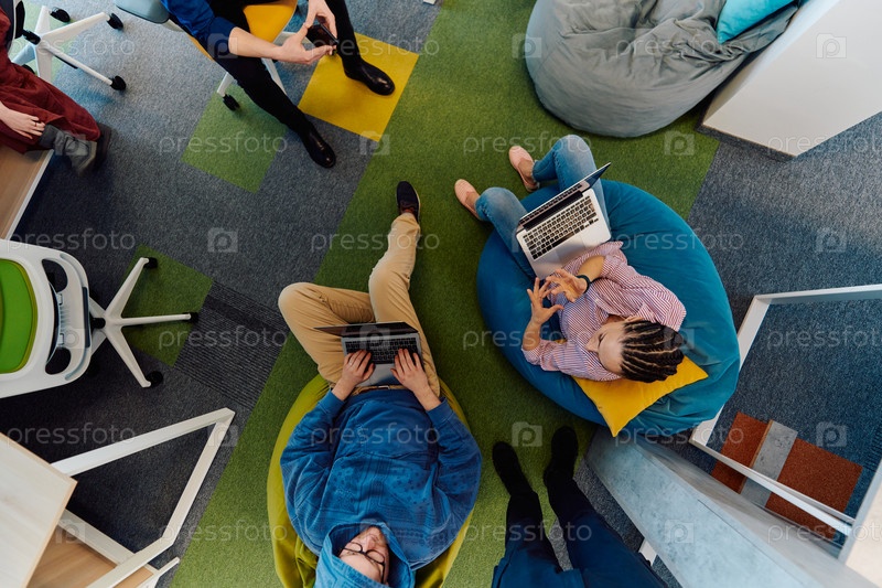 Фотография сверху процесса сотрудничества многонациональной квалифицированной молодой бизнес-команды во время мозгового штурма в офисе. Разнообразная группа молодых людей, одетых в официальную одежду, сотрудничает