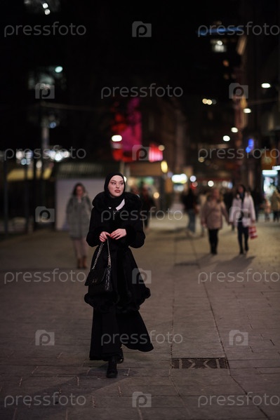 Мусульманка идет по городской улице холодной зимней ночью в хиджабе